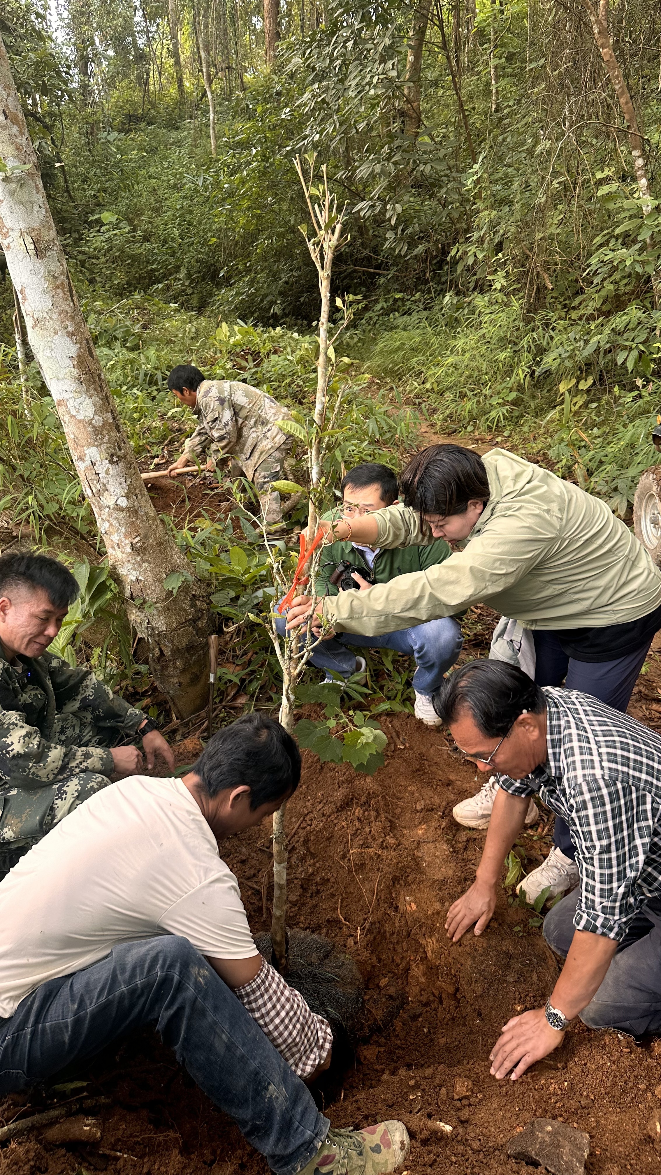 2024年至2025年,在西双版纳热带植物园恢复生态组的指导下,自然向善团队与安乐村村民共同开展茶树移栽实践,成功将33棵茶树从单一地块移植至“林茶共生”的次生林环境中,成活率达96%。